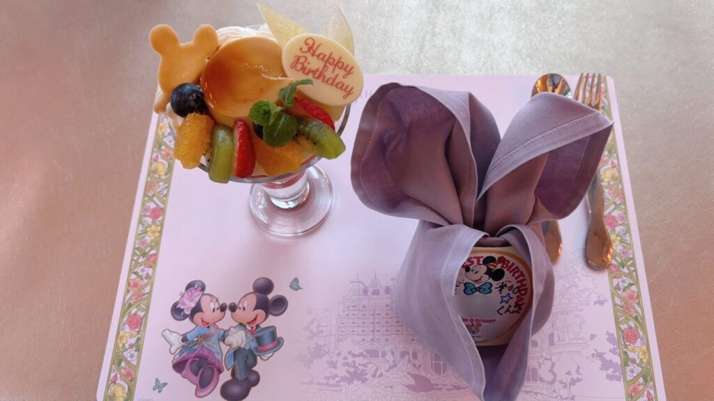 お誕生日シールを身につけていたからか、「ハッピーバースデー」のチョコのトッピングや、ミッキーに形作られたナフキンにシールのプレゼントのサプライズも。