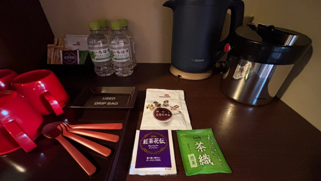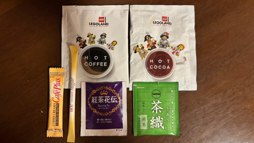 いろはすのペットボトルの水や、コーヒー、紅茶、煎茶、ココアなどが用意されていました。