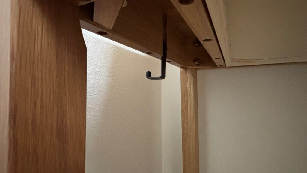 両脇にはフックがついていて、かばんや上着をかけるのに便利。