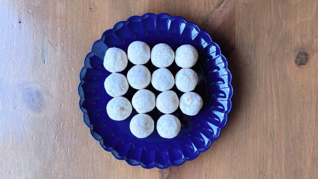 雪の玉という名前のフランス菓子をアレンジしました。レモンピール入りのペーストを生地に練り込み、レモンパウダー入りの粉糖をかけて仕上げました。