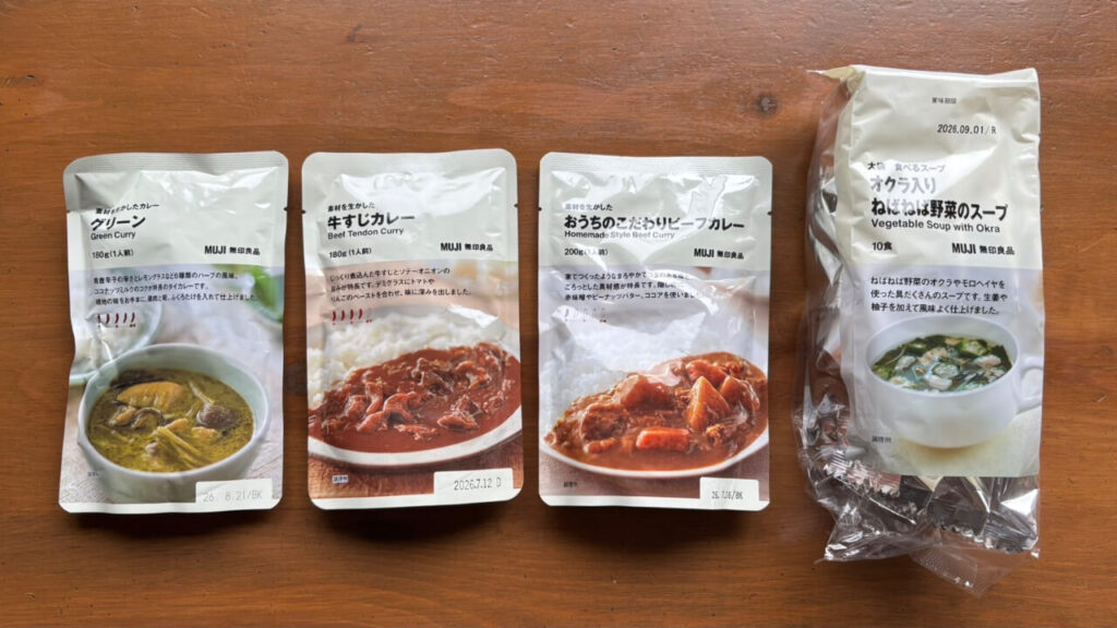 定番のレトルトカレーは防災用のストックにもなるので、無印週間にまとめ買いしています。